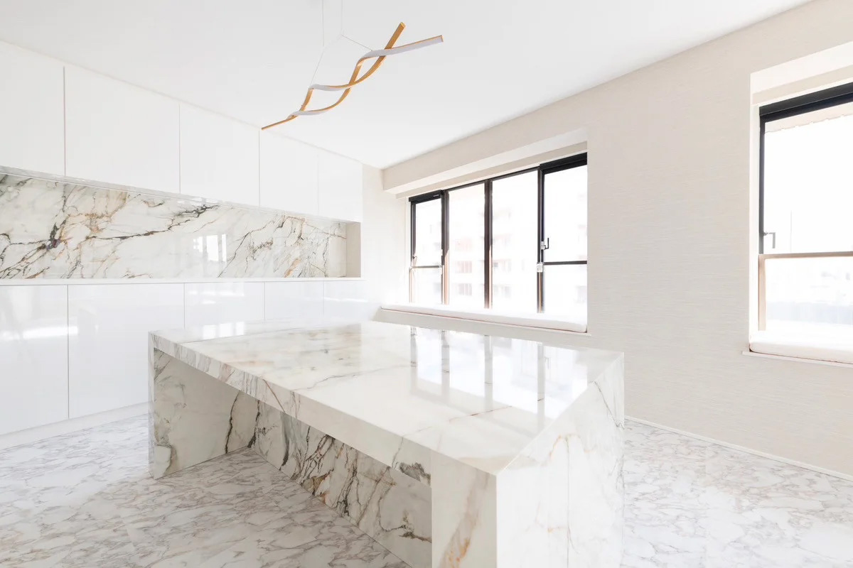 天然石で製作した背面収納とダイニングテーブル
