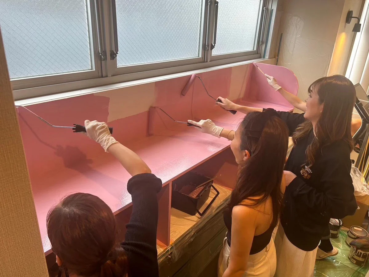 クロスではなく「塗装で仕上げる」楽しさを実感でき、「おしゃれな空間を自分でつくれる」と好評です。リノベの魅力を体験する特別な時間をぜひ。【DIY塗装イベント】 今回はCANYちゃんの生みの親であるアーティストさんご本人が、造作棚に“MERCURY × CANYちゃん”のアートを描いてくださいました! ピンクに浮かぶコラボアートは空間に個性と彩りを加え、大好評のDIY体験となりました。